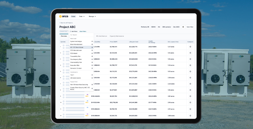 With Anza, instantly see dozens of product options optimized for your project and access constant market intelligence at your fingertips. Use our solar and energy storage data and analytics platforms to rapidly filter the market-wide view based on technical requirements, trade risk, FEOC, domestic content, and counterparty terms. See the best products for your projects ranked by lifetime value. Explore our pricing data and supply chain intel during development or when you aren’t actively procuring. Anza empowers you to evaluate virtually every available product and supplier in a fraction of the time, enabling more business wins and increased margins.