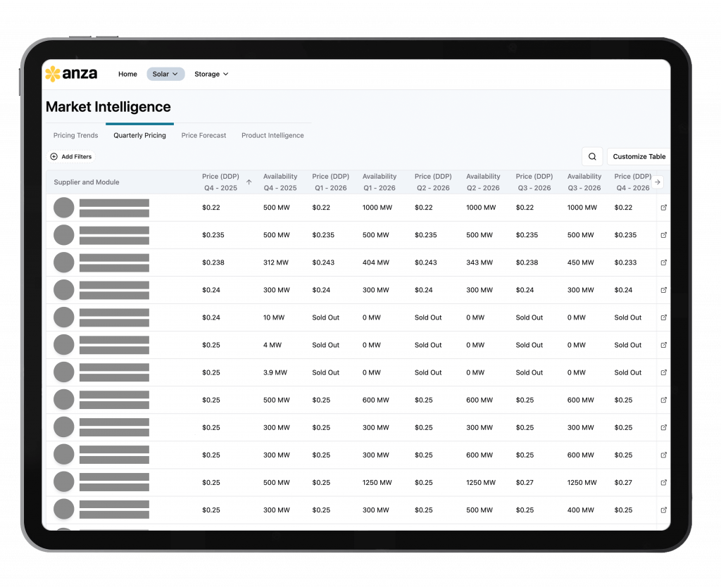 Learn about Anza’s platforms that provide accurate solar module and energy storage supplier pricing, tariff, domestic content, counterparty, and technical data from across the market.