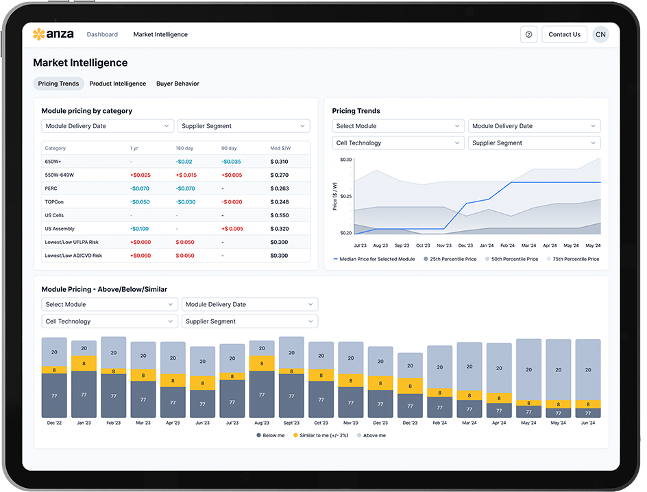 Using Anza, PV, battery energy storage system, and transformer manufacturers can gain real-time access to the growing U.S. market. Receive intelligent, fast feedback about your products through the Anza platform, including market traction, competitive positioning, and insights on pricing or specification changes that may improve close rates. Expand your U.S. sales opportunities with Anza.