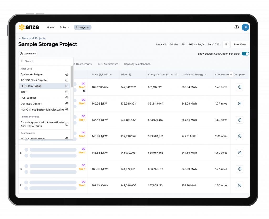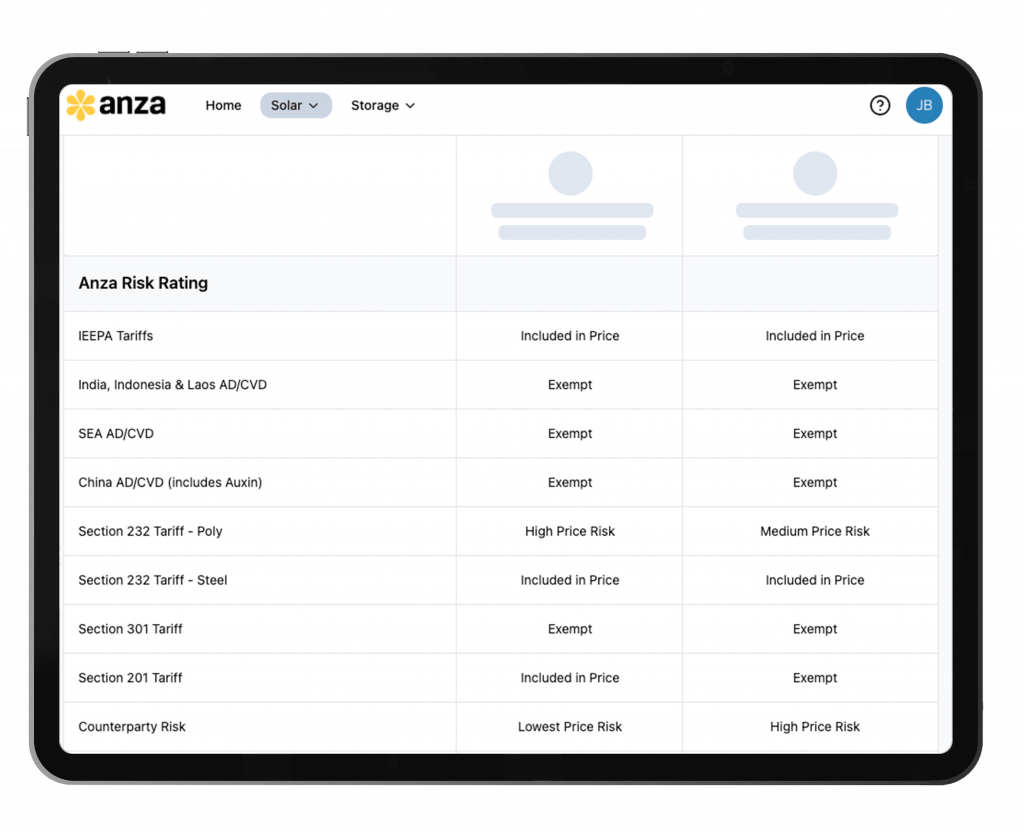 Not sure which supplier options are the best choice to reduce unforeseen supply chain risks? Or having trouble tracking policy changes and collecting the intel you need for project planning? Navigate current market dynamics and stay up-to-date on the latest tariff, trade risk, and policy changes with Anza. Quickly view the key supply chain data fields necessary to assess FEOC compliance, tariffs, UFLPA, AD/CVD, and counterparty risk and find the best option to fit your risk profile. Filter for U.S. based manufacturing or assets and non-Chinese manufacturing and gain confidence in your product selections. Get the clarity you need if you plan to utilize the ITC with extensive FEOC data and tracking of supplier compliance plans.