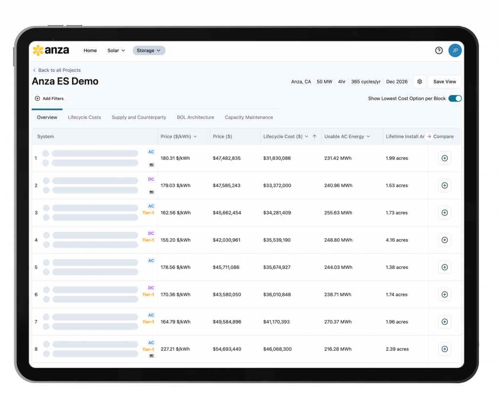 Our proprietary platform engine, coupled with our industry-leading database of cost, technical, trade risk, and commercial information, gives equipment buyers and developers the critical solar and energy storage data and analytics they need. Only the Anza platform provides rapid comparison tools, automated analysis, and rankings of solar module and BESS options by lifetime value, helping you to simplify processes, increase efficiency, and win more business.