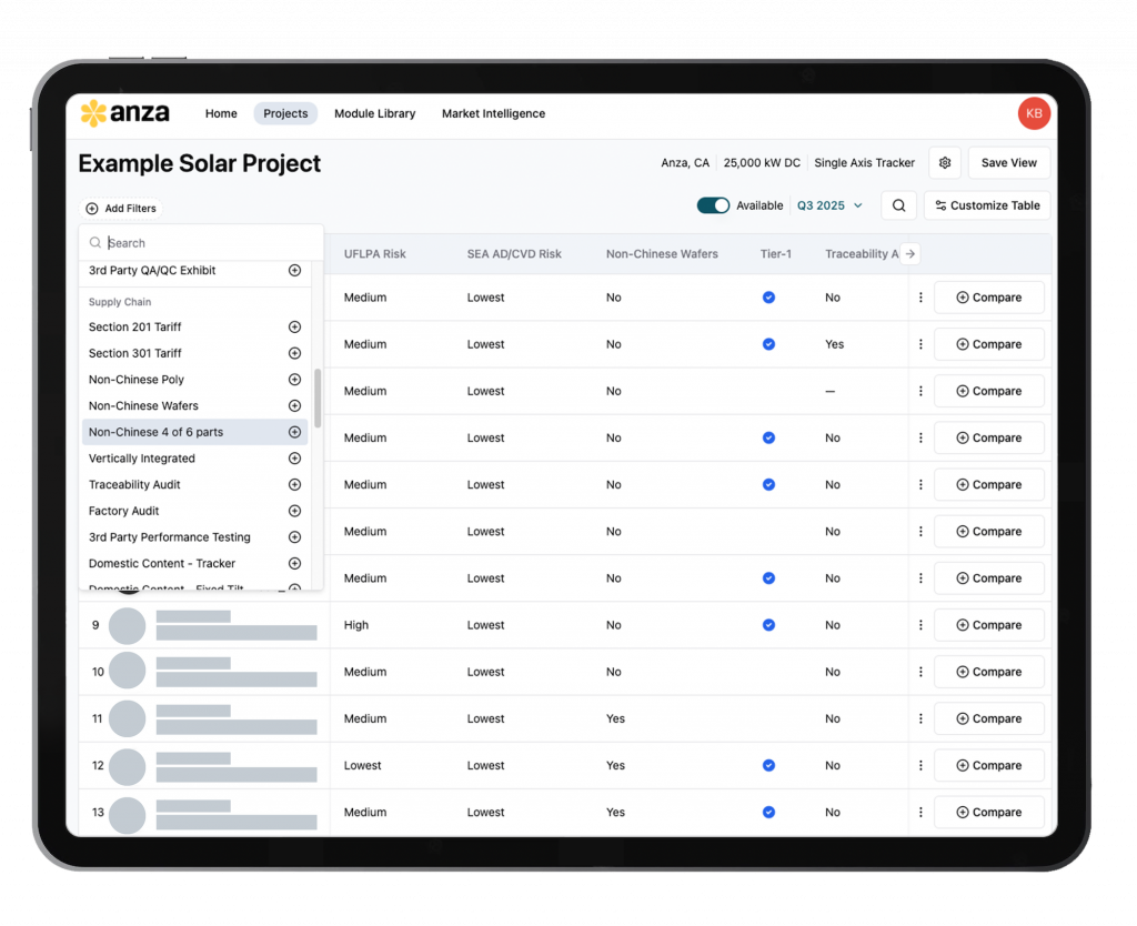 Narrow down the long list of available product options directly in the Anza platform to meet your project requirements. Easily hide or filter options using a wide range of data fields including product technical specifications, manufacturer information, and risk assessments, including our FEOC Risk Rating. With the most current direct-from-supplier pricing, availability, product specs, and documentation at your fingertips, you can find the solar panel data you need faster and use it easily.