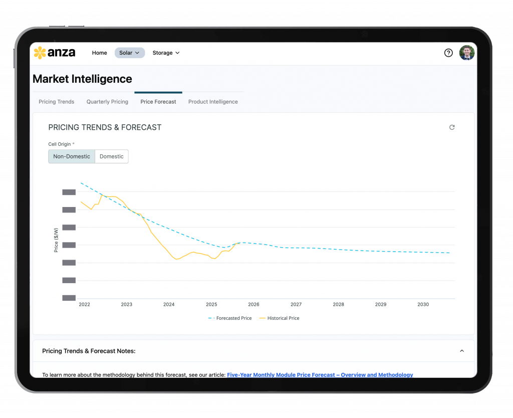 Gain unprecedented visibility into current and future module pricing during development, procurement, asset sale, or purchase. Our Predicted Quote tool enables you to see a negotiated price range, derived from recent anonymized quotes on comparable products. With Anza’s Predicted Quote data, buyers can achieve better economics and accelerate vendor negotiations. Plan for further out project development, PPA bids, and interconnection applications using a five-year monthly price forecast based on actual project quotes (not surveys and assumptions). This unique tool is created using machine learning models trained on a structured two-year dataset from 35+ suppliers, with 10,000+ verified platform price points.